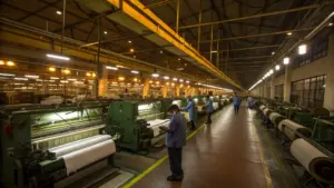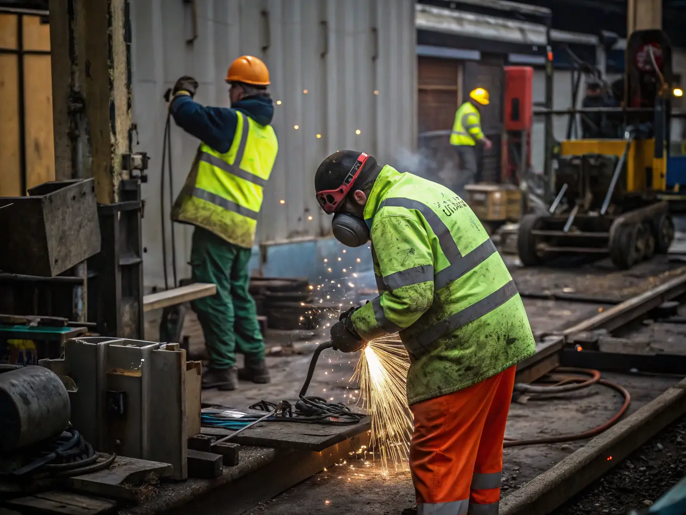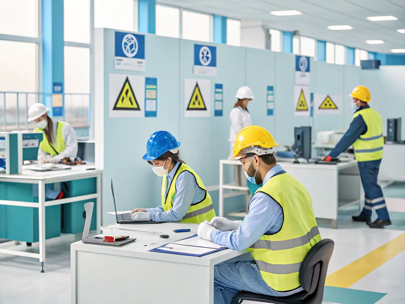 - Workers in industrial safety gear operating machinery in a factory setting