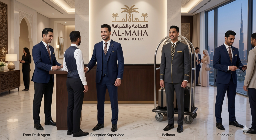 - Hotel staff in branded uniforms serving guests in a luxurious lobby