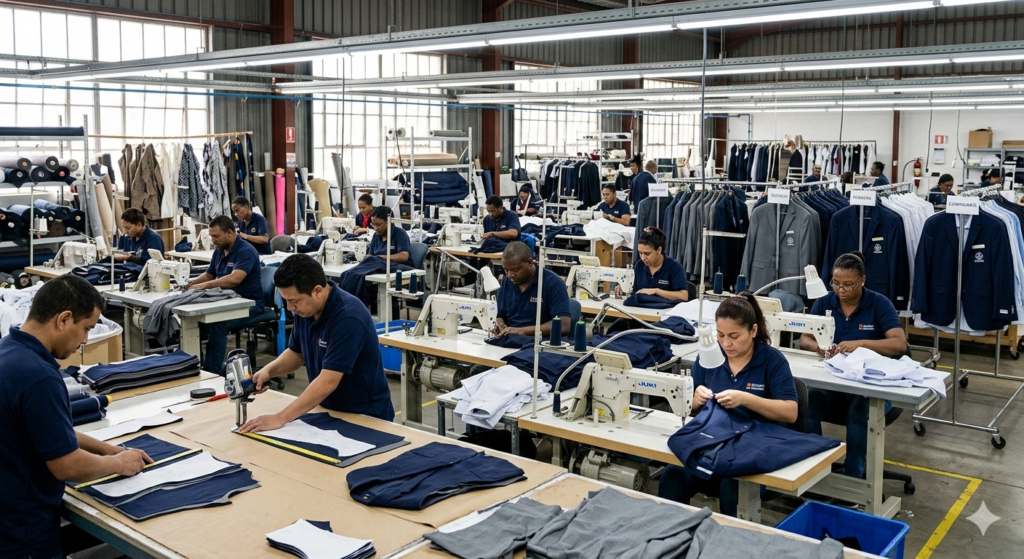 The image captures the bustling interior of a professional garment factory specifically tailored for corporate apparel. In the foreground, the process begins with precision cutting, where a worker uses industrial tools to follow white paper patterns laid out on dark navy fabric, ensuring every piece of the uniform meets exact specifications. This transition flows into an expansive assembly line of workstations equipped with heavy-duty industrial sewing machines. Each operator is focused on a specific component of the garment, such as sleeves or collars, illustrating a highly organized and efficient production workflow.