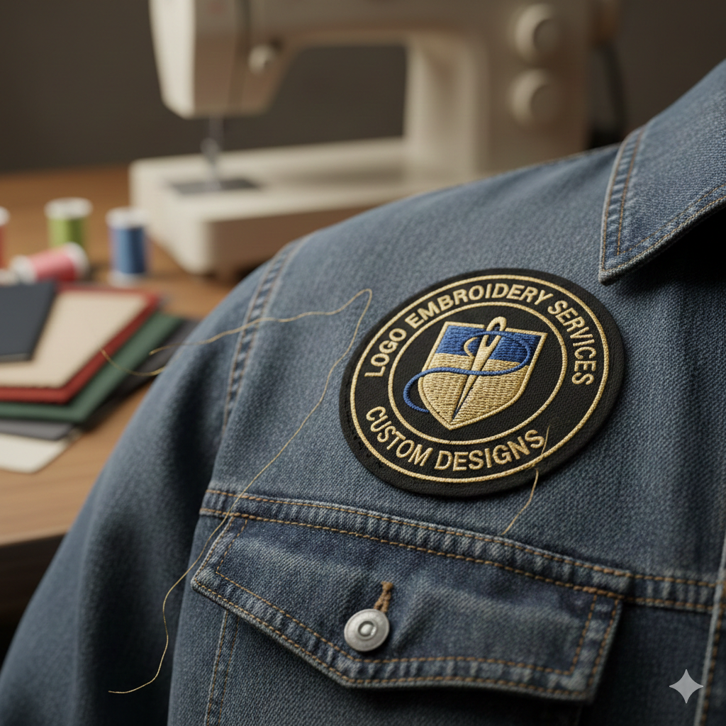 This image presents a high-quality, professional depiction of custom logo embroidery work. Centered in the frame is a rugged denim jacket sleeve, showcasing a finely stitched circular patch that features a shield icon integrated with a needle and thread motif. The text “LOGO EMBROIDERY SERVICES” and “CUSTOM DESIGNS” is neatly embroidered in a clean, gold-colored font along the border of the patch.