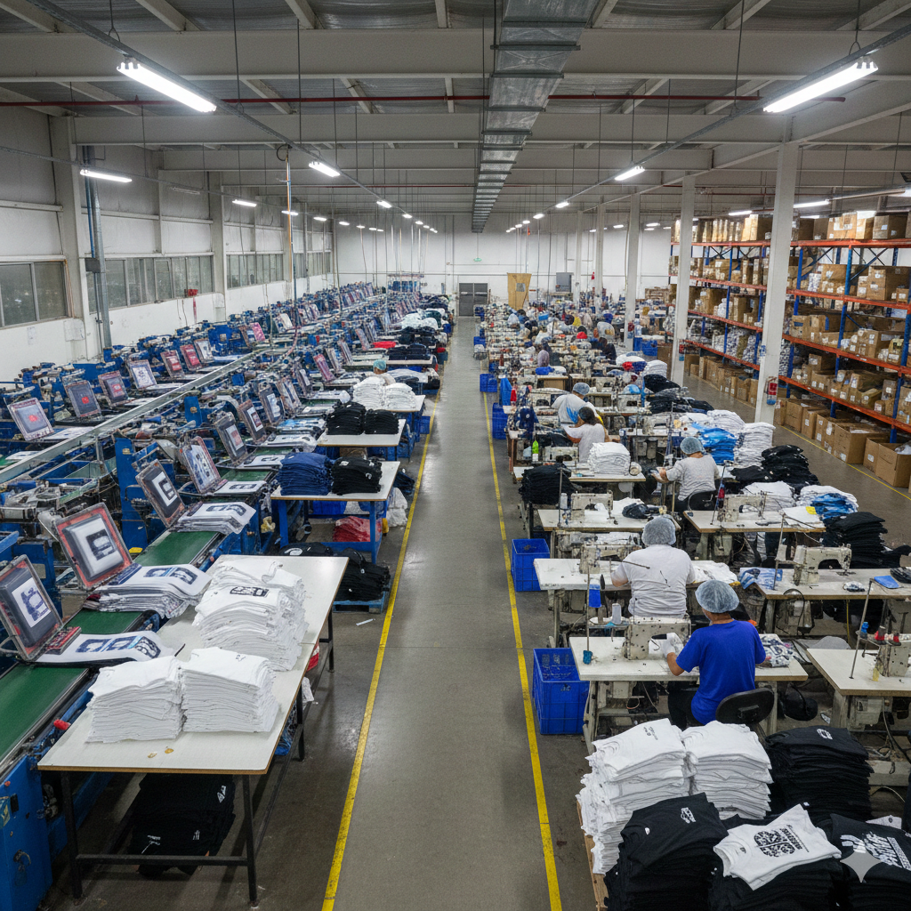 This image provides a wide-angle perspective of a bustling, industrial-scale apparel manufacturing facility focused on t-shirt production. The expansive floor is organized into long, parallel rows where workers sit at industrial sewing machines, diligently assembling garments. To the left, a long series of automated screen-printing stations are visible, featuring stacks of folded shirts ready for processing.