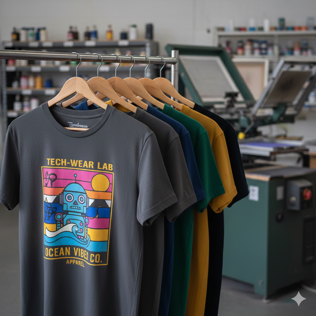 This image captures a professional screen printing and branding environment, featuring a row of freshly printed t-shirts neatly hung on a garment rack. The foreground is dominated by a gray t-shirt showcasing a vibrant, retro-futuristic graphic design featuring a robot, a sunset, and ocean elements, with the text “TECH-WEAR LAB” and “OCEAN VIBES CO. APPAREL” clearly displayed.
