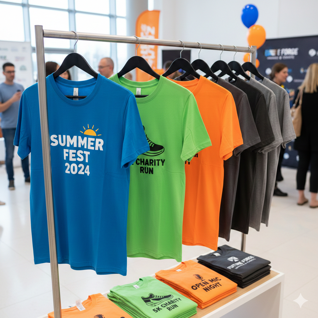 The generated image captures a vibrant display of promotional event apparel neatly organized on a retail rack and a display table within a bright, professional event space. A variety of colorful T-shirts are showcased, featuring distinct branding for different occasions such as a Summer Fest, a charity run, and an open mic night. The atmosphere feels lively and ready for attendees, with the clothing serving as functional merchandise that helps build excitement and community identity for the various events.