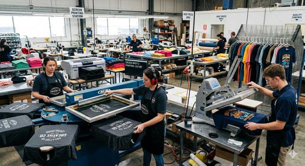 The image showcases a high-energy, professional custom T-shirt manufacturing floor where every stage of production is happening simultaneously. In the foreground, workers are operating a large multi-station rotary screen printing press, which is the industry standard for applying vibrant, multi-layered ink designs onto fabric. Nearby, a modern Direct-to-Garment (DTG) printer handles detailed digital designs, functioning much like a high-tech paper printer but specifically for apparel.